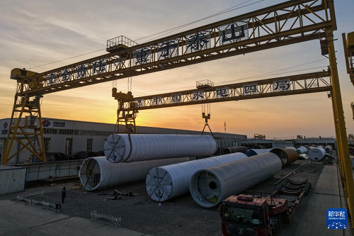 11月20日,在甘肅省酒泉經(jīng)濟(jì)技術(shù)開發(fā)區(qū)的中國水電四局(酒泉)新能源裝備有限公司裝運生產(chǎn)線上,工作人員進(jìn)行風(fēng)機(jī)塔筒吊裝作業(yè)(無人機(jī)照片)。(新華社記者 郎兵兵 攝)