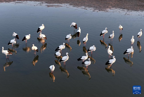 11月30日,東方白鸛在河北省唐山市豐南區(qū)沿海濕地水面上覓食(無(wú)人機(jī)照片)。(新華社記者 楊世堯 攝)