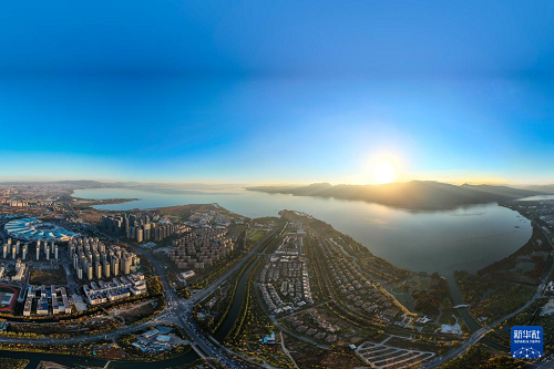 12月10日拍攝的滇池一景(無人機全景照片)。(新華社記者 彭奕凱 攝)