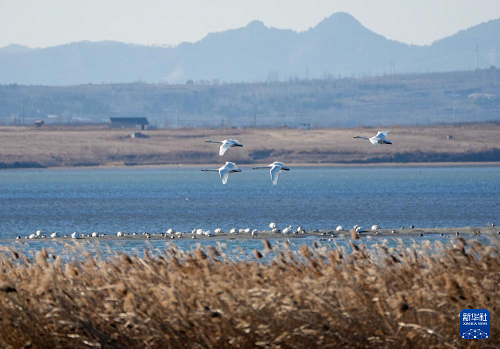 1月5日,大天鵝在榮成大天鵝國家級自然保護區(qū)棲息。(新華社記者 徐速繪 攝)