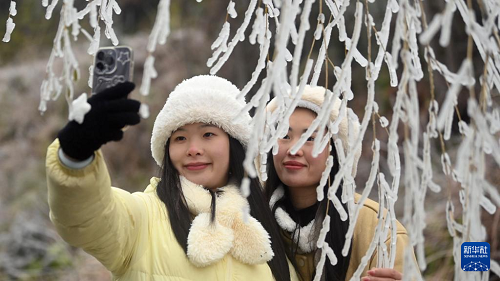 1月21日,在三江侗族自治縣侗天湖茶產(chǎn)業(yè)示范區(qū),兩名侗族姑娘在冰凌間拍照留念。(新華社記者 張愛林 攝)