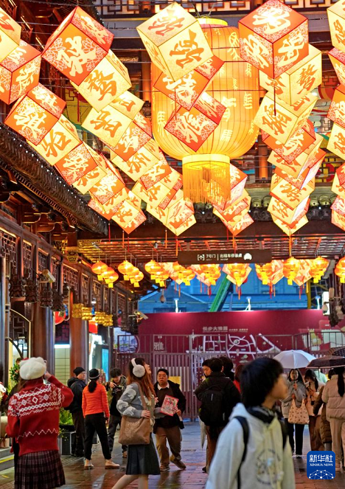 1月26日,豫園燈會上的春聯(lián)與流光溢彩的花燈營造出新春的喜慶氛圍。(新華社記者 劉穎 攝)