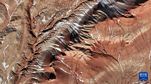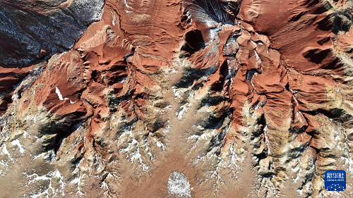 紅崖臺地位于內(nèi)蒙古烏蘭察布市四子王旗北部,是內(nèi)蒙古四子王國家地質(zhì)公園的重要組成部分。這里山丘聳立、溝壑縱橫,山體呈現(xiàn)赤紅色。隆冬時節(jié),稀薄殘雪點綴其間,在蒼茫天地中勾勒出一幅靜謐而壯麗的自然畫卷。