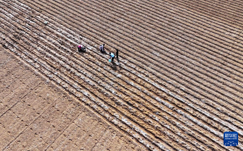 2月13日,在山東省棗莊市山亭區(qū)桑村鎮(zhèn),農(nóng)民在播種馬鈴薯(無(wú)人機(jī)照片)。(新華社發(fā) 李宗憲 攝)