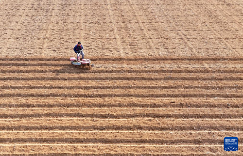 2月13日,在山東省棗莊市山亭區(qū)桑村鎮(zhèn),農(nóng)民駕駛農(nóng)機(jī)開溝準(zhǔn)備播種馬鈴薯(無(wú)人機(jī)照片)。(新華社發(fā) 李宗憲 攝)