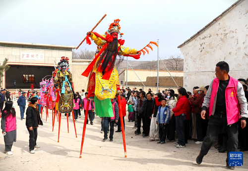 2月23日,社火隊員在甘肅省平?jīng)鍪徐o寧縣李店鎮(zhèn)李店村表演踩高蹺。(新華社發(fā) 王毅 攝)