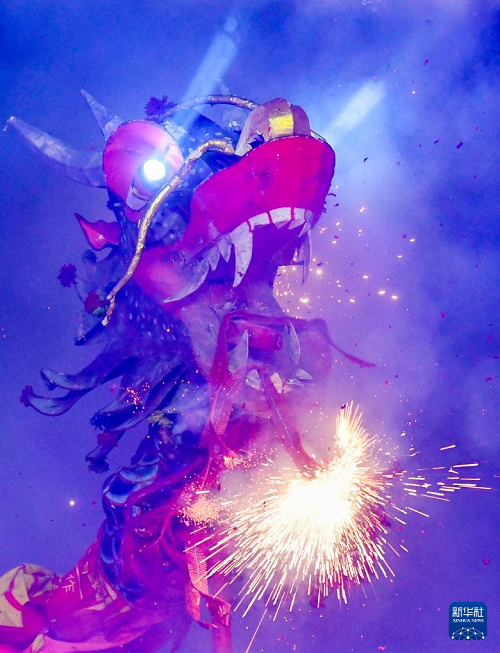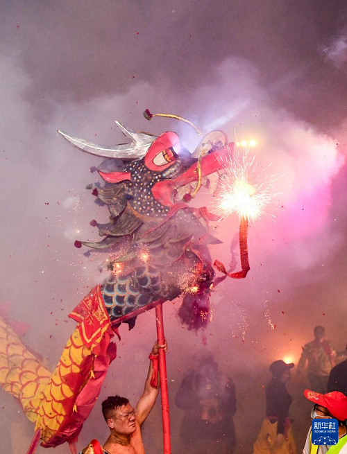 2月27日,在廣西賓陽縣炮龍文化廣場,人們在炮龍節(jié)上舞炮龍。(新華社記者 陸波岸 攝)