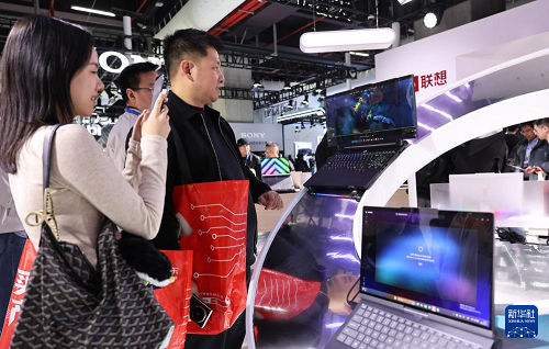 3月12日,參觀者在東方樞紐展區(qū)現(xiàn)場一款屏幕可伸縮的筆記本電腦產(chǎn)品前駐足觀看。(新華社記者 方喆 攝)