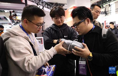 3月12日,參觀者在東方樞紐展區(qū)現(xiàn)場查看一只由熱塑性聚氨酯彈性體TPU材質(zhì)3D打印的可穿運動鞋。(新華社記者 方喆 攝)