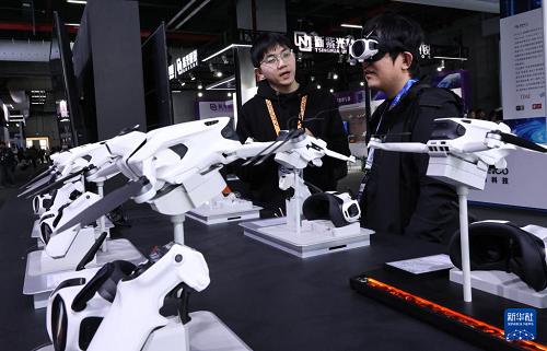 3月12日,參觀者(右)在東方樞紐展區(qū)現(xiàn)場佩戴智能眼罩體驗全景飛行器視角。(新華社記者 方喆 攝)