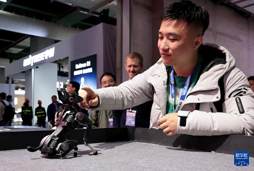 3月12日,參觀者在東方樞紐展區(qū)現(xiàn)場與一個名叫“哮天Sirius”的公斤級可訓(xùn)練機器狗互動。(新華社記者 方喆 攝)