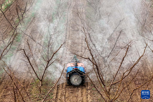 3月19日,山西省運(yùn)城市平陸縣張村鎮(zhèn)的農(nóng)民為果樹(shù)噴灑農(nóng)藥(無(wú)人機(jī)照片)。(新華社記者 曹陽(yáng) 攝)