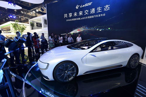 4月25日,觀眾在參觀車展展出的樂(lè)視電動(dòng)汽車。當(dāng)日,2016(第十四屆)北京國(guó)際汽車展覽會(huì)在京開(kāi)幕。新華社記者鞠煥宗攝