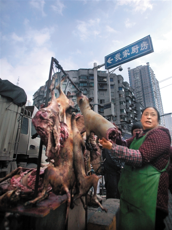 在貴陽市新路口菜市場上宰殺生狗、火燒狗皮,販賣狗肉的攤販一家接著一家