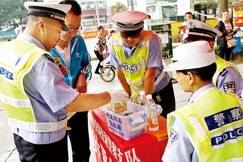 考試期間,市公安局交警支隊在各考點設置了便民服務點,備好遮陽傘、雨傘、保溫水桶、礦泉水和考試專用的鋼筆、橡皮。便民服務臺還放置一個小藥箱,里面?zhèn)溆星鍥鲇?、防暑藥、藿香正氣水、感冒藥、腹瀉藥、速效救心丸、降壓藥等應急藥品,以防考生及家長急用。