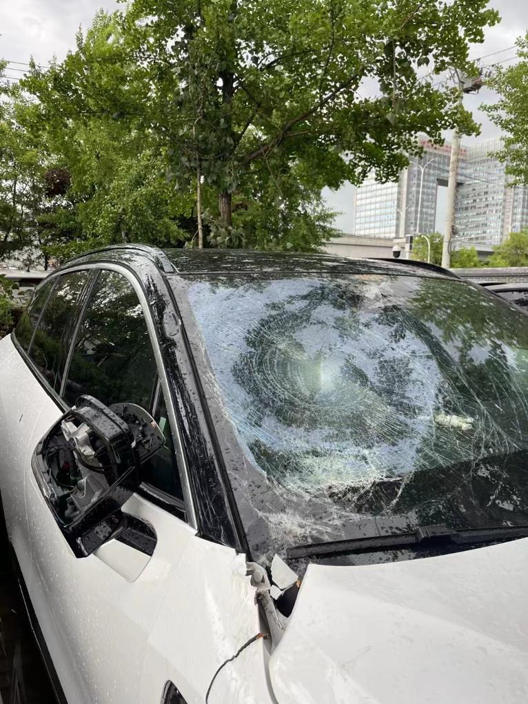 北京市民張先生的車輛在一次較強(qiáng)雷雨天氣中遭樹木砸毀(5月30日攝)。新華社發(fā)