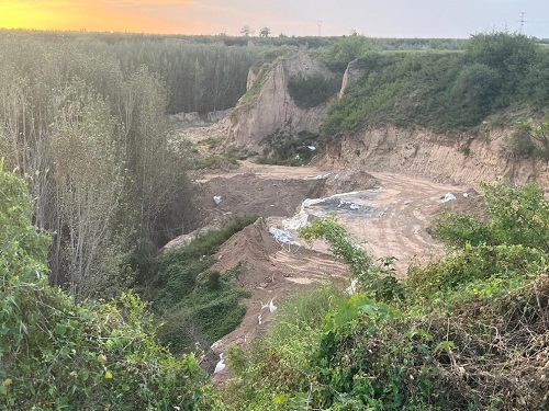 該地距離縣城40多公里,危廢填埋處距離省際分界線黃河的直線距離不足5公里。含砷危廢存放在多個(gè)白色包裝袋中,上面覆蓋黃土,進(jìn)入土溝的路口安裝有上鎖的鐵門。