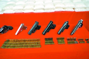 繳獲的作案手槍。 廣東邊防摧毀毒販“CC”計(jì)劃 偵破特大走私毒品案 繳獲毒品717公斤、槍支9支、豪車(chē)11輛、人民幣150萬(wàn)元 一個(gè)神秘計(jì)劃暗藏驚天秘密,攪動(dòng)著邊防偵查員神經(jīng);一段跌宕起伏的潛伏偵查戲,上演真人版速度與激情;一次前所未有的緝毒閃電戰(zhàn),阻斷毒品出境海上通道……昨日上午,廣東省公安廳召開(kāi)新聞發(fā)布會(huì)通報(bào)一起特大走私毒品案:今年2月28日,在公安部邊防管理局和省公安廳領(lǐng)導(dǎo)指揮下,廣東省公安邊防總隊(duì)聯(lián)合東莞市公安局在東莞、惠州、佛山等地同時(shí)收網(wǎng),破獲“1·26”特大走私毒品案,搗毀了一個(gè)企圖武裝走私販賣(mài)毒品出境的特大犯罪團(tuán)伙,共抓獲犯罪嫌疑人28名(其中中國(guó)臺(tái)灣籍犯罪嫌疑人15名),繳獲冰毒約717公斤,手槍9支,子彈349發(fā),毒資現(xiàn)金人民幣150萬(wàn)元、港幣200萬(wàn)元及銀行卡若干,以及奔馳AMG、奧迪Q7、寶馬5系等作案車(chē)輛11輛。 記者 張丹羊 邱偉榮 通訊員 陳思映 張嘉琦 線索: 金主毒販接頭密謀“CC”計(jì)劃 2015年12月22日,廣東省公安邊防總隊(duì)偵查隊(duì)突然接到一條來(lái)自福建省公安邊防總隊(duì)的線索。線索顯示,一個(gè)境內(nèi)外互相勾結(jié)的販毒集團(tuán)正在密謀一個(gè)代號(hào)為“CC”的行動(dòng)計(jì)劃,企圖從廣東秘密籌措一批毒品出境,“金主”(毒品投資人)林某來(lái)自中國(guó)臺(tái)灣,60多歲,道上綽號(hào)“元三”,與其里應(yīng)外合的神秘人物,極有可能就是去年粵閩邊防警方聯(lián)合偵破的一起武裝販毒案中的漏網(wǎng)之魚(yú)——代號(hào)“187”——這是當(dāng)時(shí)辦案人員根據(jù)掌握到的僅有的手機(jī)線索,給他取的代號(hào)。 經(jīng)偵查,偵查員發(fā)現(xiàn),元三入境以后七成以上均落腳在東莞市黃江鎮(zhèn)某五星級(jí)酒店。據(jù)此,上級(jí)公安機(jī)關(guān)指令廣東省公安邊防總隊(duì)偵查隊(duì)聯(lián)合東莞市公安邊防支隊(duì)偵查隊(duì)組成專(zhuān)案組共同偵辦此案,由邊防總隊(duì)業(yè)務(wù)部門(mén)和東莞市公安局、邊防支隊(duì)領(lǐng)導(dǎo)成立聯(lián)合指揮部??墒牵癈C”行動(dòng)具體是什么計(jì)劃?“CC”是地名還是人名?是英文縮寫(xiě)還是拼音縮寫(xiě)?或是暗語(yǔ)?專(zhuān)案組成立伊始,第一次案情分析會(huì)上,圍繞“CC”是什么的話題首先成為最熱烈的討論話題。 沉寂半個(gè)月后,“金主”元三被偵查發(fā)現(xiàn)以商人身份從中山市入境廣東,落腳點(diǎn)還是東莞市黃江鎮(zhèn)某五星級(jí)酒店。專(zhuān)案組派出偵查員對(duì)酒店內(nèi)外進(jìn)行監(jiān)視。就在當(dāng)晚零時(shí)左右,一輛黑色奔馳AMG豪華轎車(chē)停在酒店停車(chē)場(chǎng),一名中等身材、稍微謝頂、有點(diǎn)駝背的神秘男子從駕駛座下車(chē)走進(jìn)酒店,車(chē)后座還有一個(gè)“黑影”叼著煙正在看手機(jī),此人寸頭發(fā)型、體態(tài)肥碩,但身份不明。半個(gè)小時(shí)過(guò)去,神秘男子一人從元三房間出來(lái),開(kāi)車(chē)離開(kāi)。 辦案民警透露,元三入境多日既不走親訪友,也不參加任何商務(wù)活動(dòng),每天深居簡(jiǎn)出,其間除了第一夜的神秘男子以外,無(wú)人來(lái)訪。相比之下,黑色奔馳AMG轎車(chē)上的兩個(gè)人活躍許多,他們常??梢砸惶熘畠?nèi)輾轉(zhuǎn)廣州、佛山、中山、東莞、惠州等地,或喝茶會(huì)友,或聚賭打牌,甚至聚眾“溜冰”。專(zhuān)案組根據(jù)偵查員拍到的相片展開(kāi)調(diào)查,確認(rèn)了密會(huì)元三的神秘男子正是線索中所指的代號(hào)“187”,有境外犯罪記錄,據(jù)說(shuō)“能搞到槍”。至于肥碩“黑影”的身份,專(zhuān)案組暫無(wú)定論,但這兩人經(jīng)常同時(shí)出現(xiàn),肯定“有料”。 偵查員發(fā)現(xiàn)這兩人較為固定的據(jù)點(diǎn),一個(gè)是位于東莞市厚街鎮(zhèn)的某檳榔店,一個(gè)是位于東莞市南城區(qū)一家名叫“天天”的快遞公司。檳榔店是一幫人打麻將聚賭的場(chǎng)所,倒是“天天”快遞公司引起了專(zhuān)案組極大興趣。這個(gè)“天天”快遞公司地處偏僻,與東莞市環(huán)城高速擦邊而過(guò),周?chē)≌?、商鋪少。蹊蹺的是,這家快遞公司長(zhǎng)期不見(jiàn)一筆快遞寄送業(yè)務(wù),卻幾乎每日豪車(chē)出入,少則兩三輛,多則五六輛,且每次公司的卷閘門(mén)都只是虛掩迎客,外人難以接近,當(dāng)然也觀察不到里面的情況。種種不合常理的跡象讓專(zhuān)案組斷定,這家快遞公司絕對(duì)是個(gè)掛羊頭賣(mài)狗肉的皮包公司。 偵查: 藏身雞舍監(jiān)視 高速公路追蹤 蹊蹺的“天天”快遞公司,成了專(zhuān)案組尋找突破的突破口。由于周邊地形空曠,同時(shí)架設(shè)在快遞公司門(mén)口左右兩個(gè)監(jiān)控?cái)z像頭直掃路面,虎視眈眈,有時(shí)還有一輛疑似把風(fēng)的車(chē)子停在路邊。面對(duì)“天天”快遞公司易守難攻的情況,專(zhuān)案組為了防止暴露,派出偵查員輪流潛伏快遞公司附近,密切監(jiān)視那里的一舉一動(dòng)?!安慌懦^(qū)里還有他們的眼線?!睂?zhuān)案組稱(chēng),他們選擇在小區(qū)圍欄內(nèi)側(cè)一處高地找到最佳觀察位置。那里是一個(gè)雞舍,雞舍用一塊廣告板擋雨,偵查員正