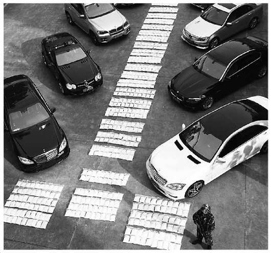 圖為警方繳獲販毒團(tuán)伙使用的豪車及擺滿操場的717公斤冰毒。 張嘉琦 攝
