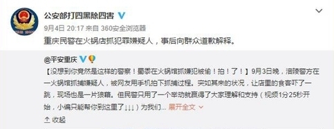 事后,有媒體了解到這名道歉者是來自重慶市涪陵區(qū)公安局荔枝派出所的一名民警。據(jù)他介紹,當(dāng)時是正在對一名長期吸販毒的犯罪嫌疑人實施抓捕。由于嫌疑人吸食毒品精神亢奮且隨身攜有刀具,抓捕過程比較激烈,不少店內(nèi)客人都起身圍觀,有些還拿出手機拍攝。抓捕結(jié)束后,帶隊民警第一時間找來餐館老板,亮明身份后表示警方會妥善處理餐館損失,并且特意向店內(nèi)顧客道歉,于是就有了視頻中顯示的畫面。