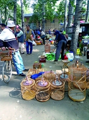 昨天上午,記者來到北沙灘橋附近,看到臨時集市藏身于一片楊樹林里,并被高高的圍墻圍了起來。樹林里賣鴿子的、賣小鳥的、賣魚的、賣蟲的、賣古玩的攤子應(yīng)有盡有。其中,售賣小鳥的攤子有五六個,有的把鳥籠直接掛在樹上,有的則在地上鋪開來,幾十只鳥籠排成一排(如圖)。據(jù)了解,有護(hù)鳥志愿者在上周末拍到的圖片中,幾百只鳥兒被關(guān)在籠里售賣。