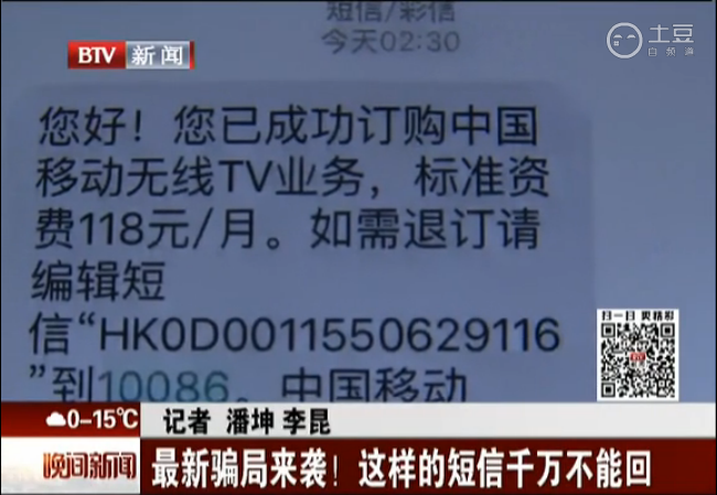 中國經(jīng)濟網(wǎng)北京11月4日訊 “您好!您已成功訂購中國移動無線TV業(yè)務,標準資費118元/月。如需退訂,請編輯短信HK***到10086?!局袊苿印俊?1月2日北京電視臺《晚間新聞》報道,近日,北京市民王小姐收到了“中國移動”發(fā)來的這樣一條服務訂購短信。