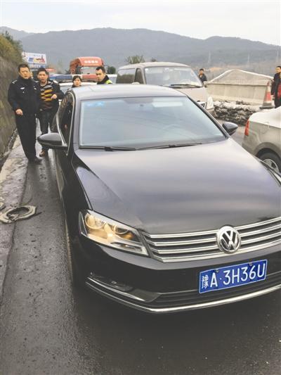 警方擋獲的嫌疑人挾持人質(zhì)沖關(guān)的其中一輛黑色大眾轎車