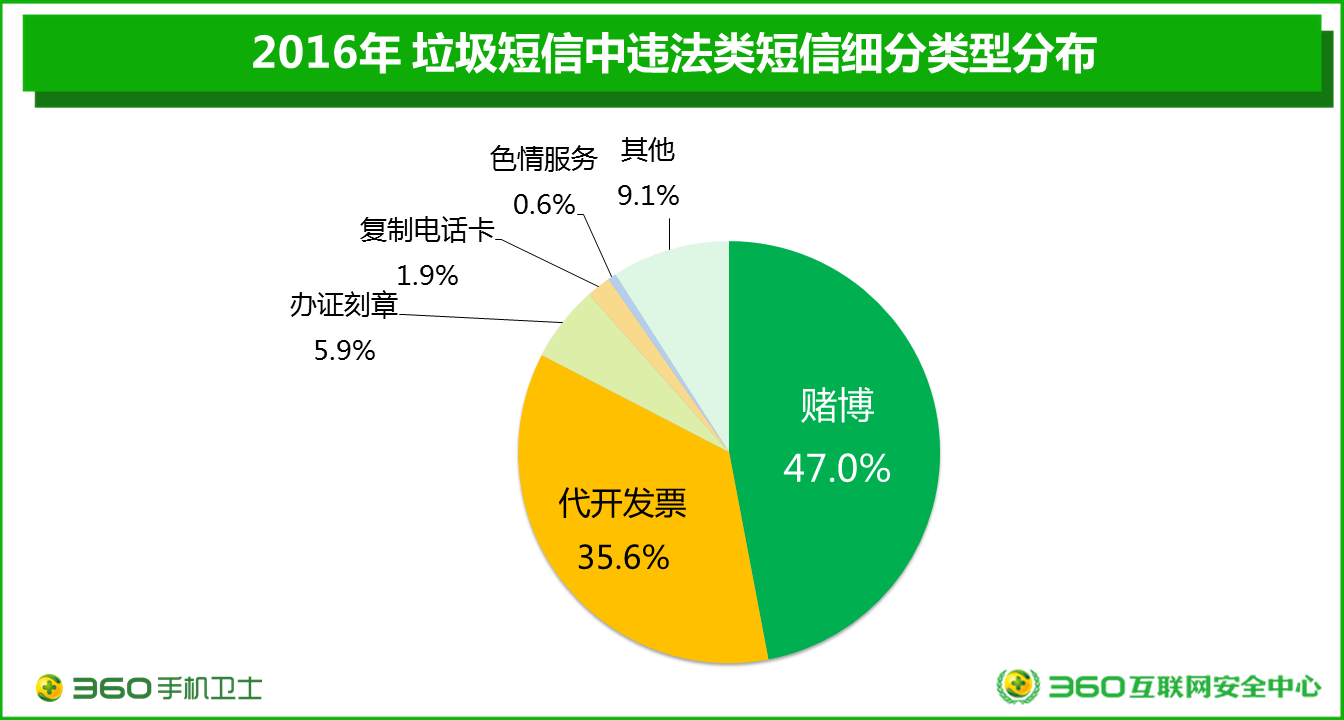 而在違法類垃圾短信中,賭博類短信的占比最高,為47.0%,其次為代開發(fā)票類垃圾短信35.6%、辦證刻章(5.9%)、復制電話卡(1.9%)、色情信息(0.6%)。相較于往年,代開發(fā)票的短信有所減少,但賭博類依然保持“第一陣營”。