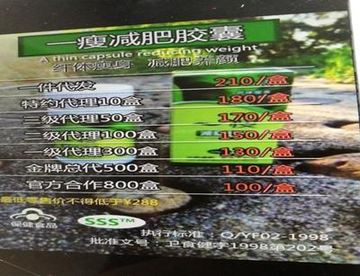 按照規(guī)定,一瘦減肥膠囊(微商俗稱“小綠”)進(jìn)貨800盒及以上,才能成為官方合作商,進(jìn)貨價(jià)一盒100元。此外,進(jìn)貨500盒、300盒、100盒、50盒,分別成為金牌總代理、一級(jí)代理、二級(jí)代理、三級(jí)代理,進(jìn)貨價(jià)每盒對(duì)應(yīng)分別為110元、130元、150元、170元。若代發(fā)貨一盒,則為210元。