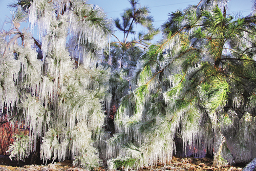 3月26日早晨,原平市交通公園的各種風(fēng)景樹木驚現(xiàn)樹掛冰凌奇觀,蔚為壯觀,吸引了市民前來觀賞。據(jù)了解,該樹掛冰凌是公園工作人員對(duì)各種花草樹木進(jìn)行春澆噴灌時(shí),由于早晨溫度較低,噴灌的霧狀水滴集結(jié)而成,到上午太陽(yáng)光照下,此奇觀已經(jīng)消失。(吉建平 攝)