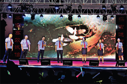 這場以“頌歌獻(xiàn)給黨,共圓中國夢”為主題的文藝晚會(huì),是保安押運(yùn)人精心組織,自編、自導(dǎo)、自演的一臺(tái)節(jié)目,就像該公司黨委書記陳志平所說:“這場文藝晚會(huì)是我們保安押運(yùn)人向黨95歲華誕獻(xiàn)上的頌歌。”6月29日第一場晚會(huì)于晚8時(shí)正式上演,晚上7時(shí)便有觀眾陸續(xù)來到演出現(xiàn)場。第一場晚會(huì)就讓觀眾大呼過癮,節(jié)目形式多樣,有小合唱、獨(dú)唱、配樂詩朗誦、舞蹈、雙簧、小品、服裝秀等。其中舞蹈《映山紅》、男生獨(dú)唱《紅旗飄飄》、電聲樂隊(duì)《閃閃的紅星》歌曲串燒等用不同的藝術(shù)形式表現(xiàn)了保安押運(yùn)人對黨和祖國的熱愛之情,感染了現(xiàn)場的觀眾;而雙簧表演《文武雙全》將晚會(huì)現(xiàn)場氣氛推向高潮,兩位表演者夸張的表情、搞笑的扮相引得觀眾連連叫好。