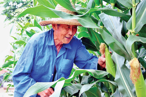 7 月4 日,原平市武彥村老農(nóng)看著長勢喜人的玉米喜上眉梢:如今惠農(nóng)政策真是好,調(diào)動(dòng)了俺們的種田積極性,利用科技種的玉米,長得好,結(jié)穗早,收入高,看著真開心。(趙春曉 攝)