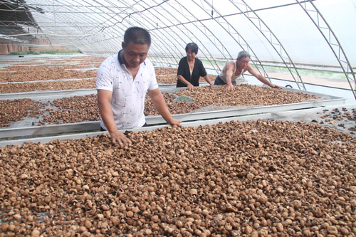 8月1日,原平市雙惠現代農業(yè)示范園區(qū)日光溫室大棚內工作人員正在整理雙孢菇進行晾曬,制作成干蘑菇,準備淡季銷售。該園區(qū)充分利用溫室晾曬有效聯接,延長蘑菇銷售時間,增加菇農收入。(褚震 攝)