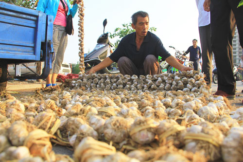 7月30日,原平市陽(yáng)房村蒜農(nóng)正在農(nóng)產(chǎn)品市場(chǎng)銷售紫皮蒜。原平紫皮蒜是當(dāng)?shù)氐钠放妻r(nóng)產(chǎn)品,盛產(chǎn)于滹沱河沿岸的新原鄉(xiāng)和西鎮(zhèn)鄉(xiāng),不僅是調(diào)味佳品,而且食用具有藥用價(jià)值,省內(nèi)外客商慕名而來(lái)購(gòu)買,深受歡迎。(吉建平 攝)