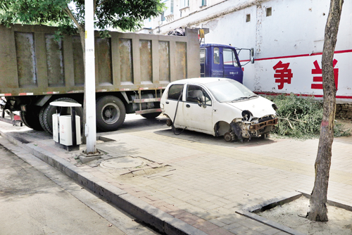 附近的居民們稱(chēng),人行道本來(lái)就不寬,這樣的“僵尸車(chē)”長(zhǎng)年累月停放在路邊不僅有礙觀瞻,而且對(duì)市民的出行造成了不小的影響。記者認(rèn)為,這些“僵尸車(chē)”如果廢棄不用的話,就該進(jìn)行報(bào)廢處理,而不是一直停放在路邊。希望車(chē)主能夠盡快現(xiàn)身對(duì)車(chē)輛進(jìn)行處理,同時(shí)也希望交警部門(mén)能夠加大監(jiān)管執(zhí)法力度,讓“僵尸車(chē)”的身影不再出現(xiàn)在街頭巷尾。圖為廢棄的汽車(chē)。(王君 攝)