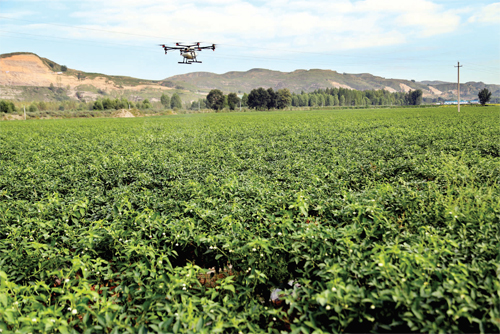 9月11日,在靜樂(lè)縣永倉(cāng)種植專業(yè)合作社辣椒種植示范園,操作人員正在遙控?zé)o人機(jī)噴灑農(nóng)藥。據(jù)了解,無(wú)人機(jī)噴灑農(nóng)藥具有速度快、效率高等特點(diǎn),1架無(wú)人機(jī)平均每天噴灑面積可達(dá)1000畝。(閆曉梅  攝)