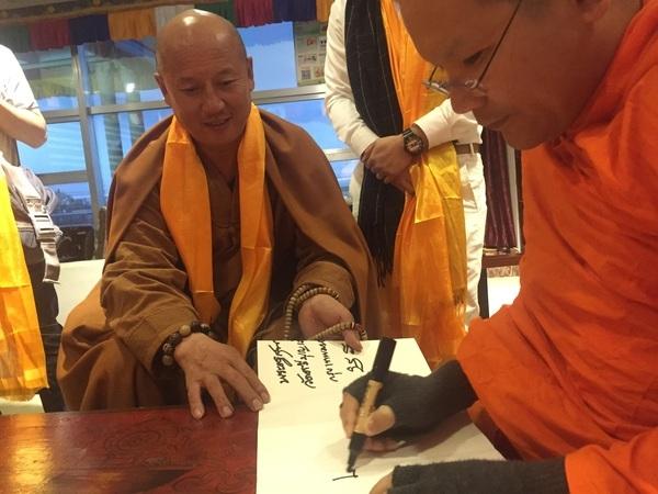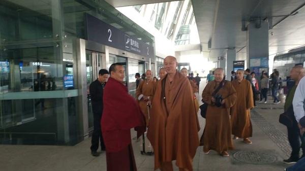 圖為五臺山望海寺住持釋覺一法師與弟子們順利到達西寧機場,木蘭加措法師前往迎接。