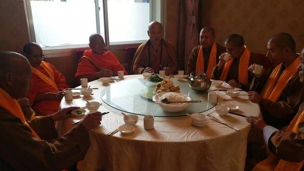 圖為五臺山望海寺住持釋覺一法師與泰國僧人共進午餐。