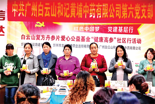 本報訊 10月21日,白云山和黃中藥公司復方丹參片愛心公益基金志愿者服務隊與忻州市吉達惠康連鎖藥店聯(lián)合主辦了“紅色中國夢、黨建基層行”愛心公益活動,向社區(qū)居民贈送了健康體檢卡及健康藥物禮包,并開展了一系列的黨建文化交流活動。
