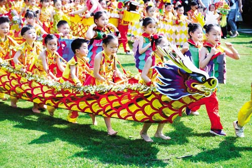 6月14日,孩子們參加旱地龍舟比賽。當(dāng)日,浙江省長(zhǎng)興縣中心幼兒園的孩子們身著傳統(tǒng)服飾、掛上香囊,并用紙板、布匹、彩繩制作的旱地龍舟參加“劃龍舟掛香囊”傳統(tǒng)民俗迎端午的活動(dòng),感受中國(guó)傳統(tǒng)文化的魅力,了解端午節(jié)的民俗文化。據(jù)新華社 記者 徐昱 攝