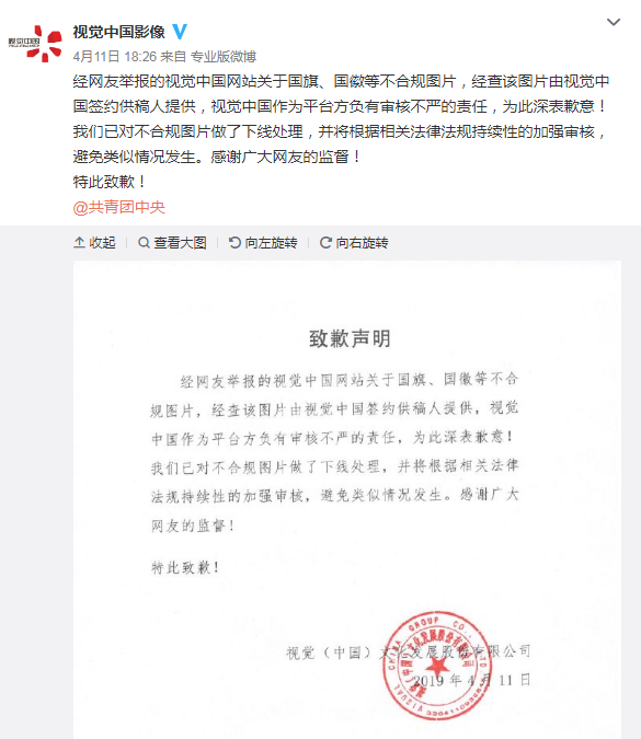 4月11日,視覺中國因黑洞照片版權(quán)問題引發(fā)公眾質(zhì)疑,共青團中央官方微博更是直接質(zhì)問“國旗、國徽版權(quán)也是貴公司的?”直指其版權(quán)不合理售賣問題。視覺中國官方微博當(dāng)日回應(yīng),經(jīng)網(wǎng)友舉報的視覺中國網(wǎng)站關(guān)于國旗、國徽等不合規(guī)圖片,經(jīng)查該圖片由視覺中國簽約供稿人提供,視覺中國作為平臺方負(fù)有審核不嚴(yán)的責(zé)任,為此深表歉意!已對不合規(guī)圖片做了下線處理,并將根據(jù)相關(guān)法律法規(guī)持續(xù)性的加強審核,避免類似情況發(fā)生。