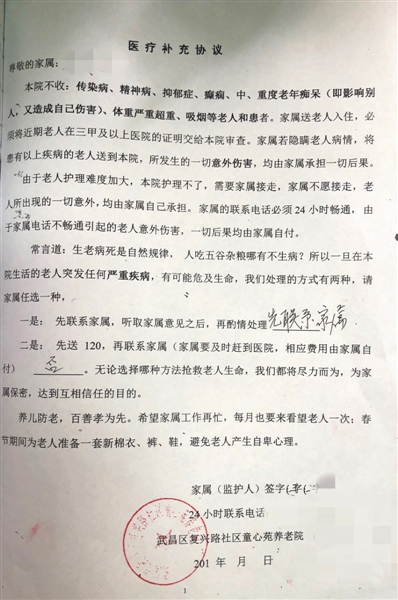 接收老人前,童心苑要求老人家屬簽訂的醫(yī)療補充協(xié)議。