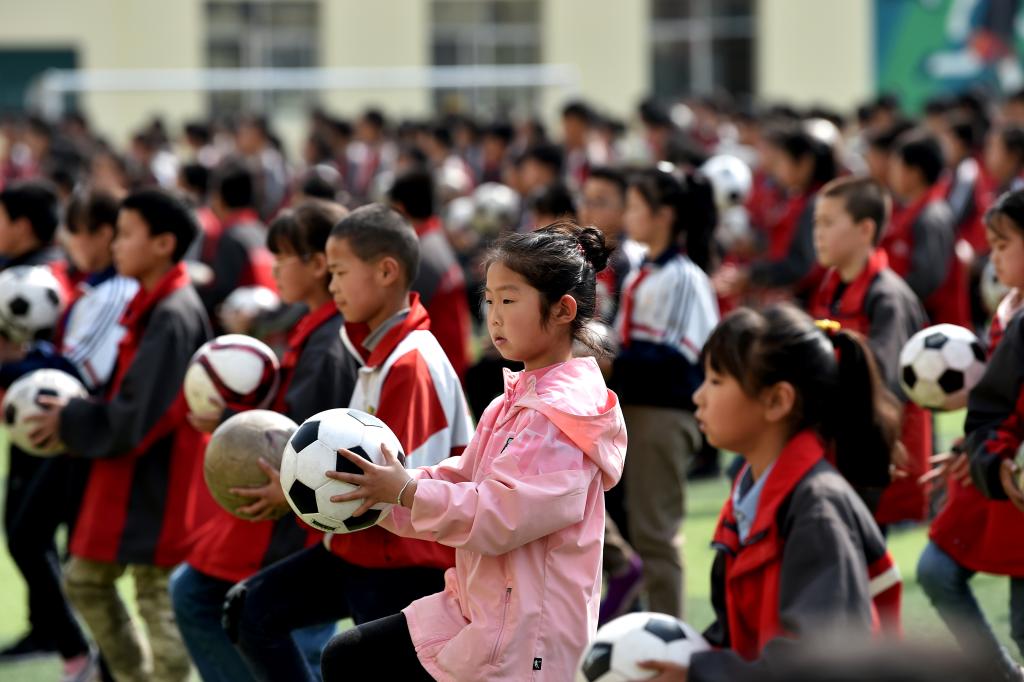 ↑這是學(xué)生們準(zhǔn)備做足球操(4月18日攝)。新華社記者李俊東攝