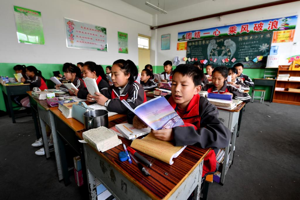 ↑這是初一121班的學(xué)生們在課堂上朗讀課文(4月18日攝)。新華社記者詹彥攝