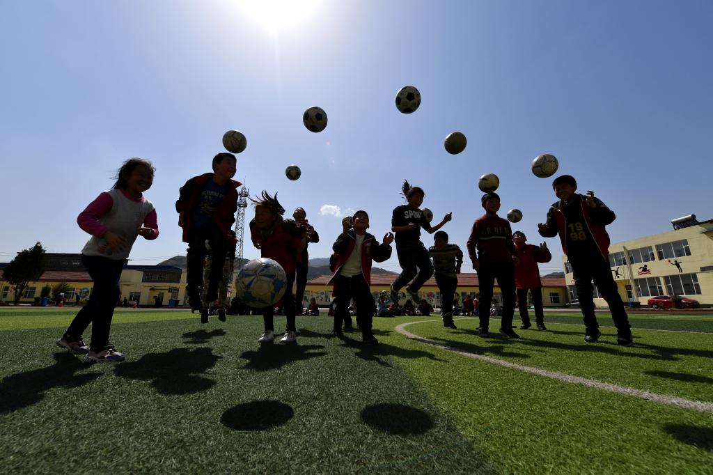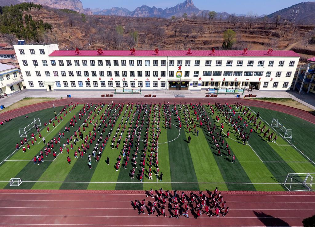 ↑這是學(xué)生們在做足球操(4月16日無人機(jī)拍攝)。新華社記者詹彥攝
