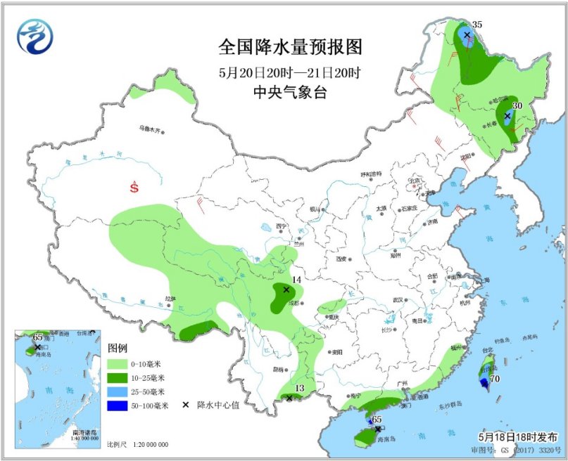 5月20日20時(shí)至21日20時(shí),四川盆地西部、黑龍江西北部和東南部、吉林東北部、廣東西南部、廣西東南部、海南島東北部等地的部分地區(qū)有中到大雨,局地有暴雨(50~65毫米)。內(nèi)蒙古東部、東北地區(qū)中南部、華北北部、黃淮東部等地的部分地區(qū)有4~6級(jí)風(fēng)。南疆盆地等地局地有浮塵或揚(yáng)沙。