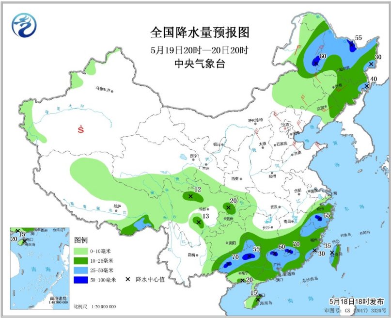5月19日20時(shí)至20日20時(shí),內(nèi)蒙古東北部、東北地區(qū)中北部、江南南部和東部、華南大部等地的部分地區(qū)有中到大雨,局地有暴雨(50~70毫米)。內(nèi)蒙古中東部、華北、黃淮、東北地區(qū)中南部等地的部分地區(qū)有4~6級(jí)風(fēng),陣風(fēng)7~8級(jí)。南疆盆地等地局地有揚(yáng)沙或浮塵。渤海西南部海域?qū)⒂?~8級(jí)、陣風(fēng)9~10級(jí)的西北風(fēng)。
