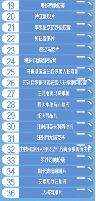 此外,肺癌、直腸癌、乳腺癌等有了更多靶向和化療藥選擇,波生坦、麥格司他等藥品的談判成功,使肺動脈高壓、C型尼曼匹克病等罕見病患者擺脫目錄內(nèi)無藥可治的困境,糖尿病、乙肝、類風(fēng)濕性關(guān)節(jié)炎、耐多藥結(jié)核、慢性阻塞性肺炎等患者也有了更多優(yōu)質(zhì)新藥可供選擇。