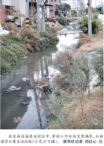 在東南沿海某省村莊中的一座小橋上,一幅寫著“小康不小康,關(guān)鍵看老鄉(xiāng)”的巨型宣傳牌十分醒目。然而,在被廣告牌擋住的地方,水面漂浮大量的塑料袋、易拉罐、泡面盒等生活垃圾,水體呈黑褐色。