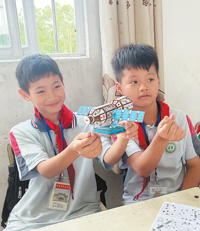 “這是航天衛(wèi)星的兩翼,是安裝太陽能電池板的地方?!眮碜詮V西壯族自治區(qū)梧州市藤縣第五小學(xué)的三年級(jí)學(xué)生李杰峰驕傲地展示著親手組裝的模型,他希望將來能從事航天工作。